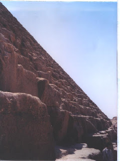(left) The Great Pyramid, from the first or second row, 2001. The stone at the very foreground is the actual height of that entire row and I believe all the ones above it as well. I'm 5'11" and it came up to my shoulder level thereabouts. I'm an architectural buff so this pic also shows how even after all this time, the angles are still about as perfect as any engineer could hope. Until you actually see this monument in person, you can't really comprehend just how massive it is.